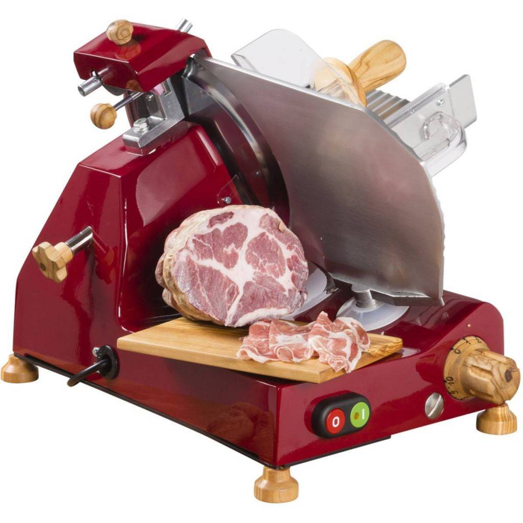 Cette trancheuse conçue est spécifiquement pour les saucisses mais elle s’adapte à tout besoin avec sa lame de 30 cm et son affûteur intégré. Elle dispose d’un grand plateau avec double surface de glissement pour faciliter la poussée du produit vers la lame. Cette trancheuse possède une molette standard avec réglage micrométrique progressif de 0 à 1,4 cm, ce qui donne la plus grand précision possible. Cette trancheuse est considérée comme professionnelle.